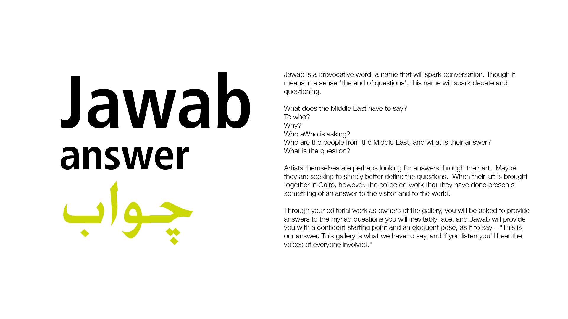 Visually, the logo is designed as a contemporary English language logo with subtle Arabic undertones; elements such as the black squares and the weight of the lines recall Arabic writing without being obviously “Middle Eastern.” Finally, it is based on a classic font, Didot, allowing it to be visually interesting while being grounded, relevant, and timeless.