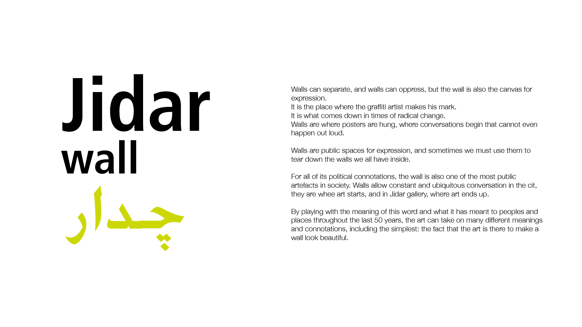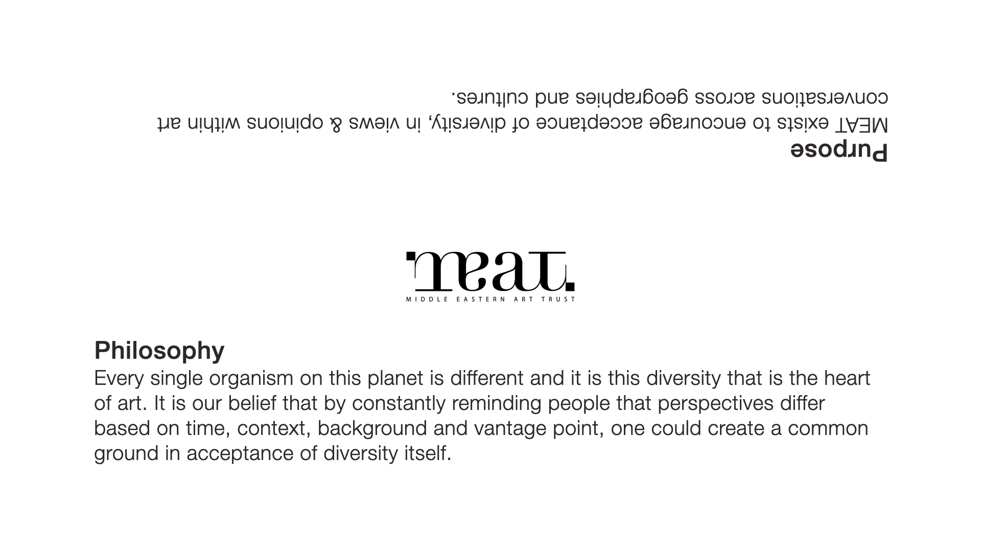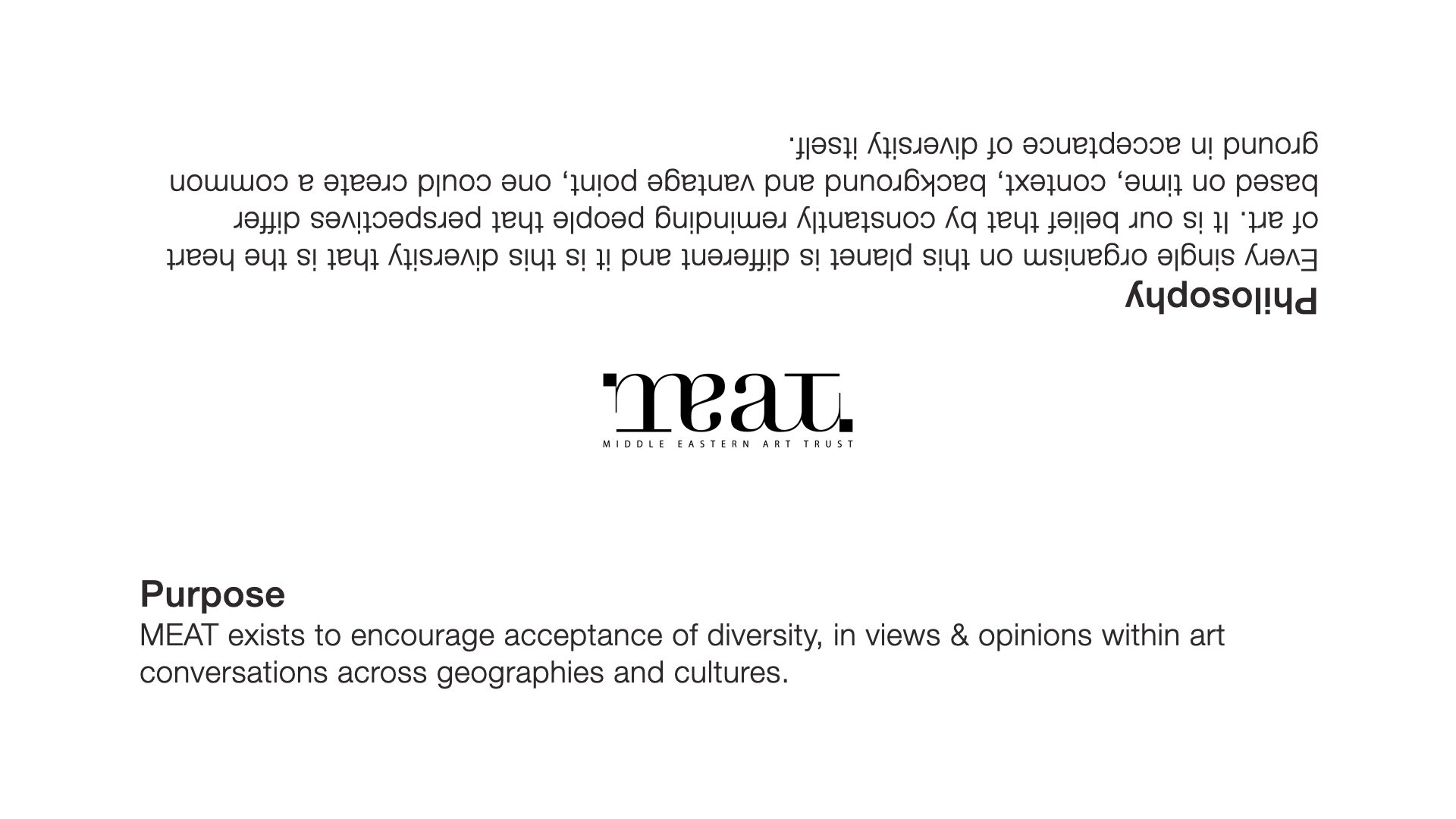 Art has been, and still is very subjective. It can encapsulate any and all human activities that are symbolic, conceptual, expressive or just technical. Geography and culture further compounds its complexity. It’s no wonder the definition of what constitutes Art is disputed[1][2][3] and has changed over time. This identity for MEAT attempts to bring a new lens on Art and the Middle East, encouraging people to bring an open mind to its meaning; because there always is.